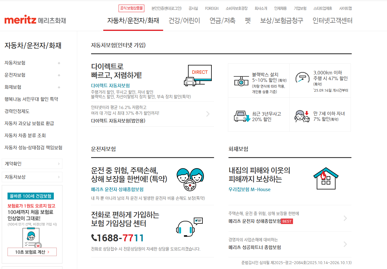 메리츠화재 다이렉트 자동차보험 가입자는 별도의 전용 번호도 있어요.