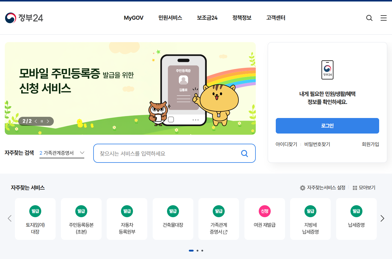 정부24는 대한민국 정부가 제공하는 다양한 민원 서비스와 정책 정보를 한곳에서 통합적으로 제공하는 플랫폼입니다. 공공기관의 서비스를 쉽고 빠르게 이용할 수 있도록 도와주는 중요한 사이트입니다.