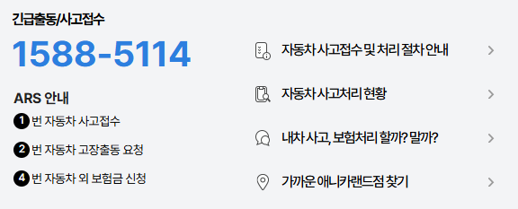 1588-5114로 전화 연결 후 ARS 1번을 선택하면 자동차 사고접수가 가능합니다.